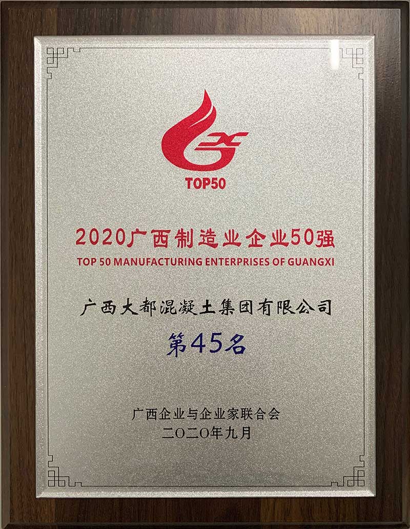 本次会议表彰了2018-2019年度广西十佳企业、十佳企业家、优秀企业和优秀企业家,发布了2020广西企业100强、制造业企业50强、服务业企业50强榜单和广西大企业发展主要研究成果。广西大都混凝土集团有限公司以26亿元的营收业绩,荣登“2020广西制造业企业50强”第45位,较去年提升了5位。