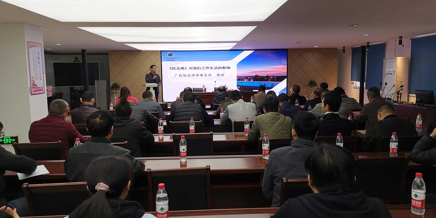 本次培训内容主要分为两个方面,一是解读《民法典》对生活工作的影响,二是学习刑法小知识。为本次培训授课的是柳州大都公司法律顾问广西佑成律师事务所副主任胡涛律师、广西佑成律师事务所合伙人户逢春律师,两位律师讲课引经据典,深入浅出,参加培训的管理人员都认真听讲,细致做笔记,课后纷纷表示获益匪浅,要结合公司生产经营管理工作实际贯彻落实。