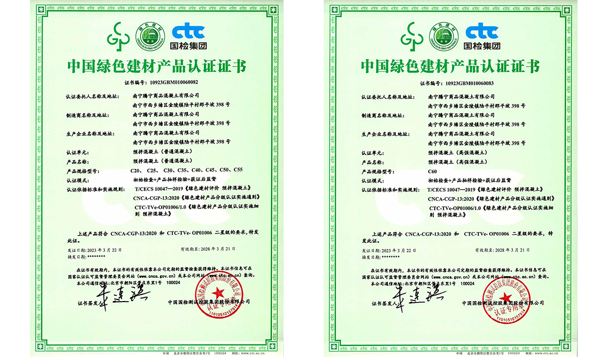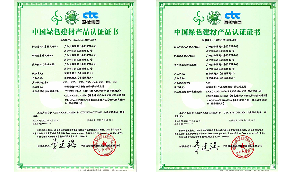 近日,广西大都混凝土集团有限公司总部和南宁腾宁商品混凝土有限公司顺利通过“中国绿色建材产品”认证,荣获由中国国检集团颁发的“中国绿色建材产品认证证书”。