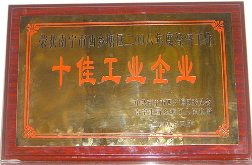 腾宁公司荣获南宁市西乡塘区二00八年度经济工作“纳税突出贡献企业”、“十佳工业企业”荣誉称号