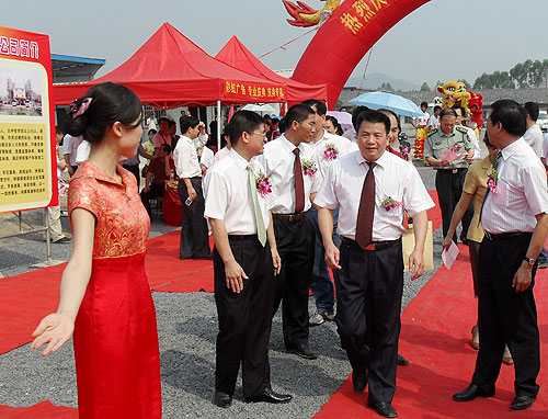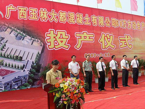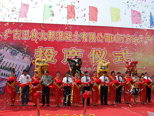 4月22日上午,玉林大都举行60万立方混凝土生产线投产仪式。集团公司副总裁杨仲英、业务部总经理伍志滨、玉林市副市长满昌学、政协副主席黄典山、玉州区书记蔡文、区长潘艳、人大主席李秀通、政协主席杨伟广、军分区政委钟绍达、茂林镇书记唐泽林等地方政府领导及相关部门人员300多人参加了剪彩仪式。