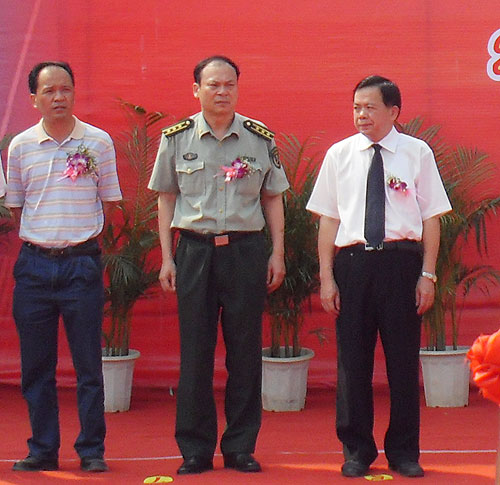 图片说明:玉州军区政委钟绍达(中)