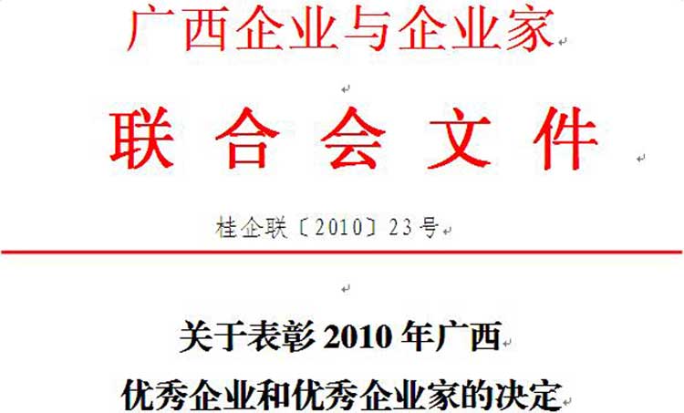 李志雄总经理荣获“2010年广西优秀企业家”荣誉称号;集团公司荣获“2010年广西优秀企业”荣誉称号。附广西企联“关于表彰2010年广西优秀企业和优秀企业家的决定”。