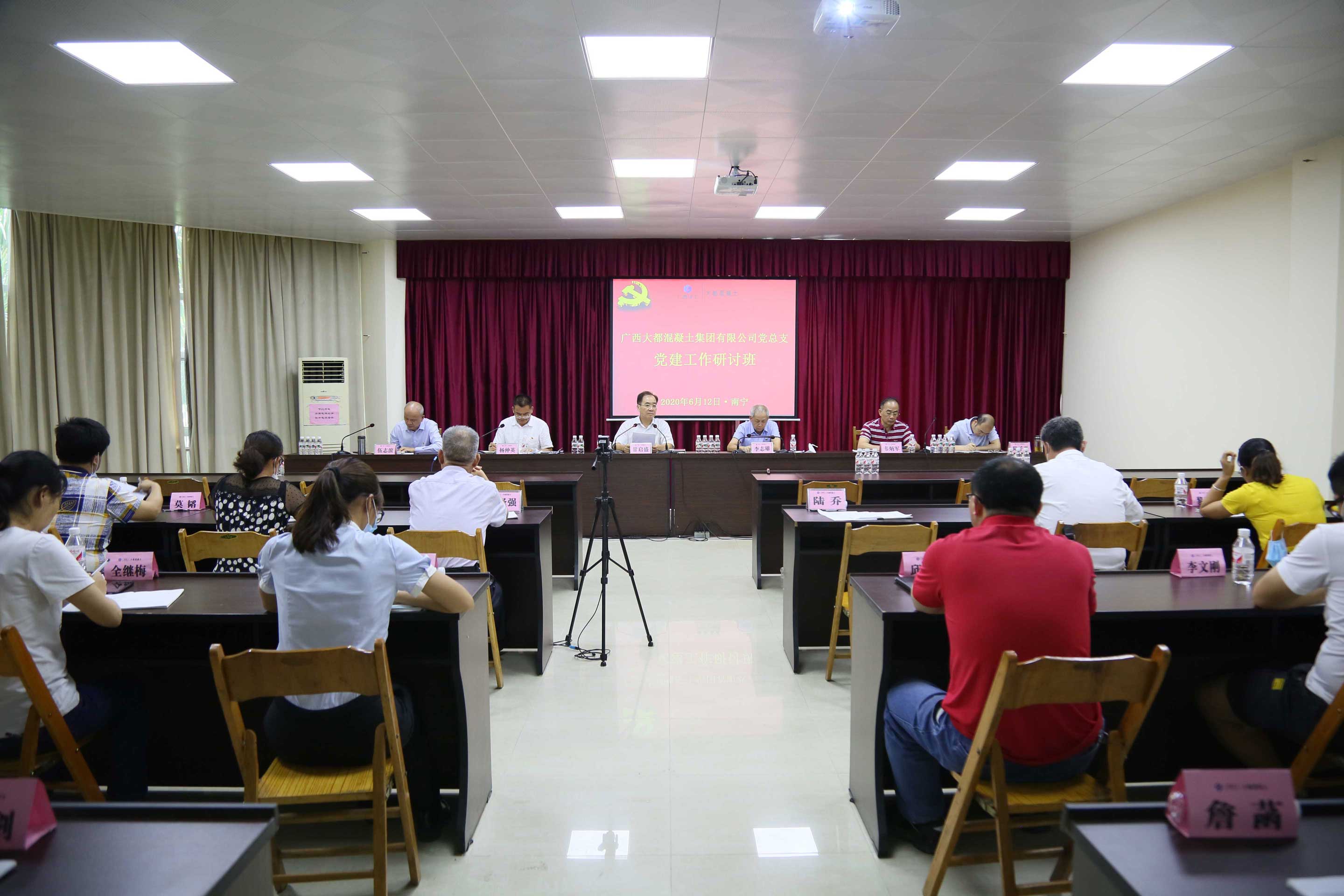 6月12日,广西大都混凝土集团有限公司党总支在总部办公楼4楼会议室举办2020年党建工作研讨班。公司党总支书记、董事长甘启盛出席并讲话,在家领导班子成员李志雄、韦炳军、伍志滨、陆子平出席。党总支组织委员、副总经理杨仲英主持。